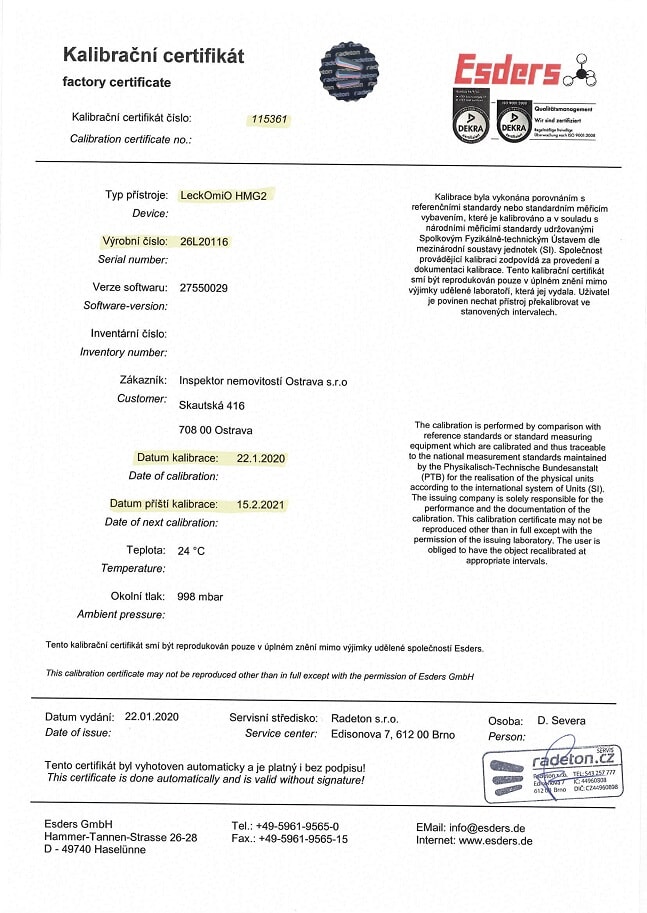 Naši inspektoři nemovitostí a revizní technici využívají při své práci špičkové profesionální měřicí přístroje a nářadí, které slouží pro snadnější diagnostiku závad, poruch jak ve stavební části – jsou to zejména přístroje na zjišťování vlhkosti, teplotní úniku z konstrukcí staveb, nerovnosti apod., tak v oblasti TZB – technická zařízení budov tzn. topení, plyn, elektro, komíny a další.